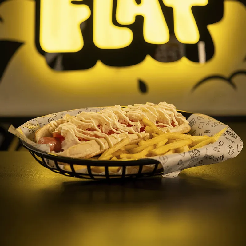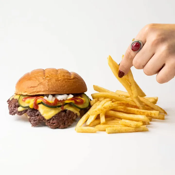 Pan de hamburguesa, hamburguesa 120g, queso cheddar, cebolla blanca en cuadritos, pepinillos en rodajas, ketchup, mostaza