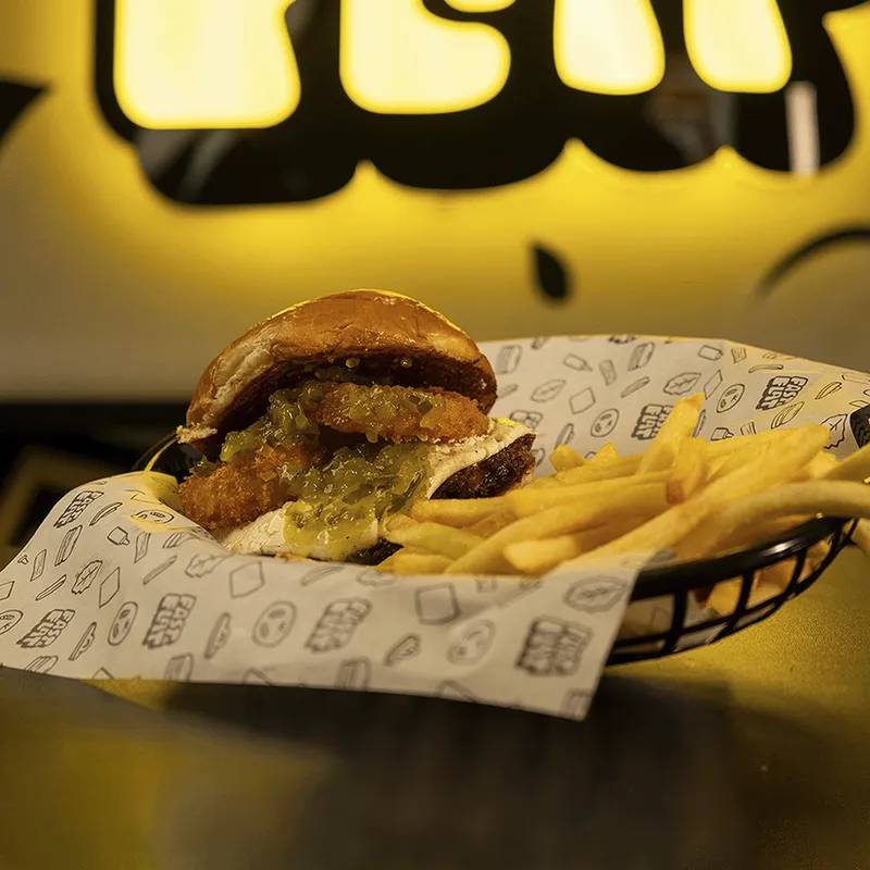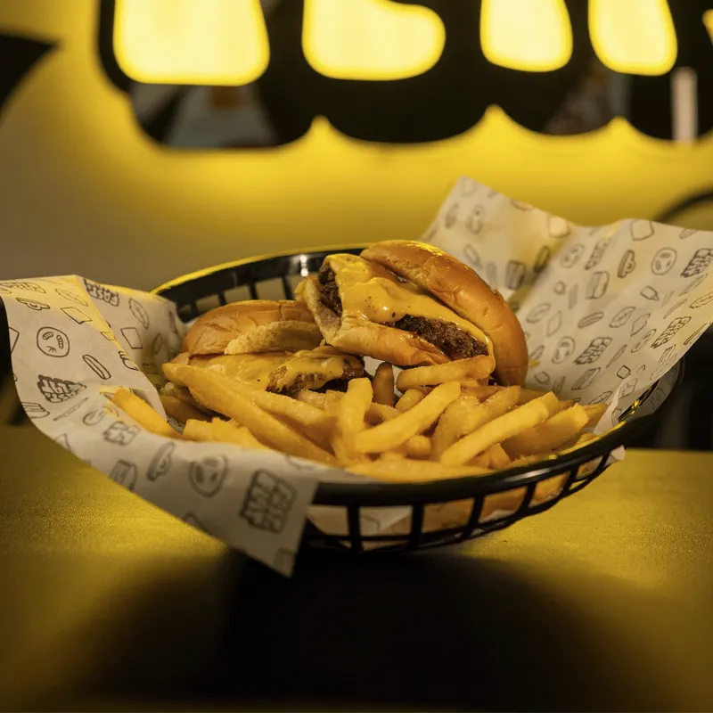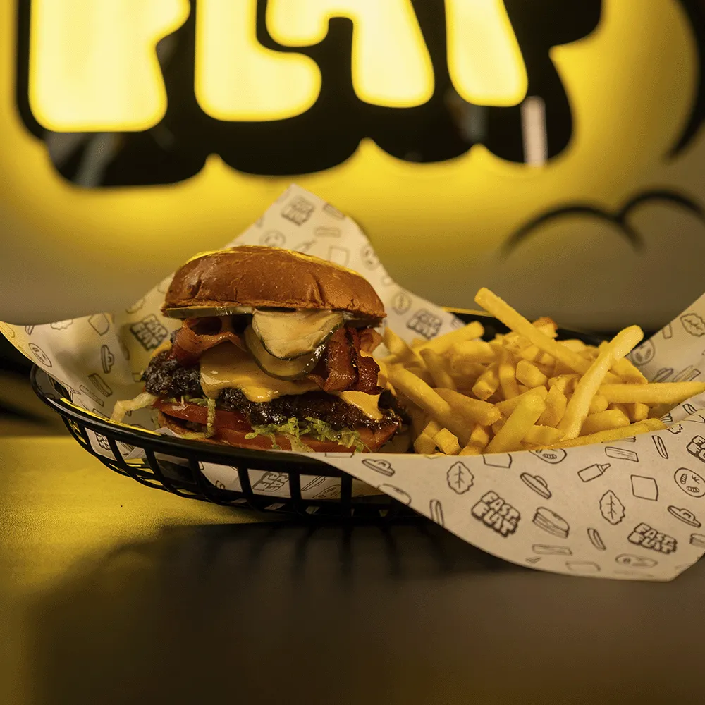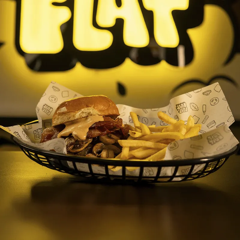 Pan de hamburguesa, hamburguesa 120g, queso cheddar, champiñones salteados, cebolla caramelizada, tocino crocante